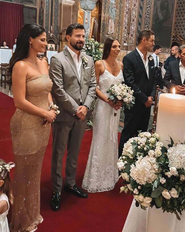 Για τον ρόλο της κουμπάρας, η σύζυγος του Σάκη Τανιμανίδη επέλεξε ένα στράπλες φόρεμα σε απόχρωση της άμμου και του χρυσού. Το φόρεμα είχε μίνι εσωτερικό και μάξι δίχτυ με λάμψεις εξωτερικά.
