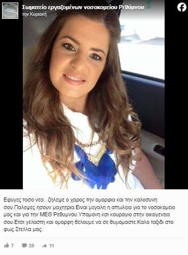 Εφυγες τοσο νεα…ζηλεψε ο χαρος την ομορφια και την καλοσυνη σου.Παλεψες ησουν μαχητρια.Ειναι μεγαλη η απωλεια για το νοσοκομειο μας και για την ΜΕΘ Ρεθυμνου.Υπομονη κσι κουραγιο στην οικογενεια σου.Ετσι γελαστη και ομορφη θελουμε να σε θυμομαστε.Καλο ταξιδι στο φως Στελλα μας.