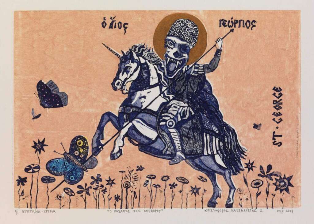 Την ώρα λοιπόν που ακόμη και άθεοι άνθρωποι, μπροστά σε αξεπέραστες ανθρώπινες δυσκολίες εκλιπαρούν τη βοήθεια της Μητέρας Παναγιάς μας, στην έκθεση αυτή παρουσιάζεται παραμορφωμένο «εικόνισμα η Παναγία με τον Χριστό αγκαλιά (άτιτλο)» ενώ σε άλλο έργο του ίδιου καλλιτέχνη ο Άγιος Γεώργιος εμφανίζεται ως “O Χασάπης της Λεωφόρου”.