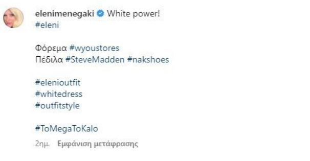 Μάλιστα, είναι ένα χρώμα που η Ελένη Μενεγάκη συνηθίζει να επιλέγει, αφού το λευκό κυριαρχεί στις φωτογραφίες στο Instagram, αλλά τα εκατοντάδες σχόλια στην ανάρτηση αυτή ήταν μια μίξη από εντυπωσιασμένους ακολούθους, που λάτρεψαν την εμφάνισή της και άλλους που στάθηκαν στο ατυχές catpion.