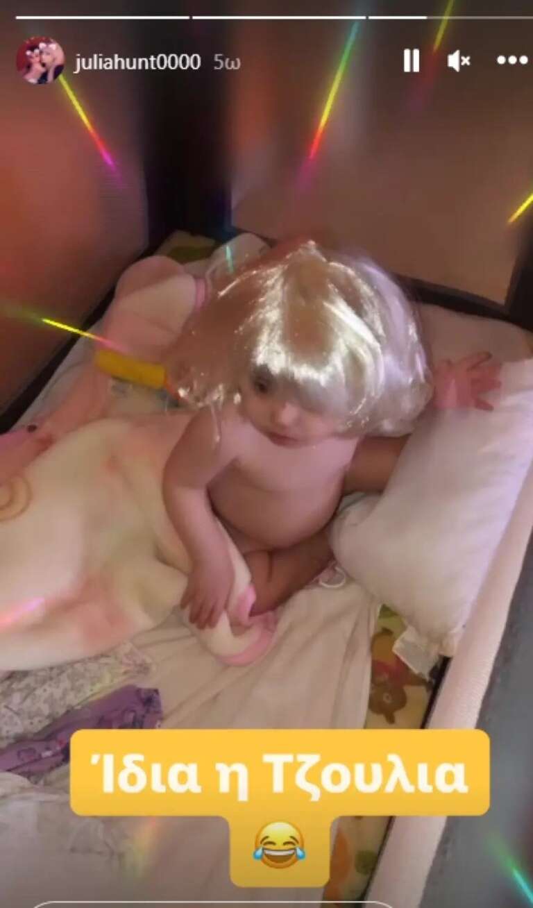 Σε ένα από τα τελευταία Instagram stories που ανέβασε, η Τζούλια Αλεξανδράτου δείχνει ξανά το μωρό, αυτή τη φορά με μια ξανθιά καρέ περούκα στο κεφάλι.