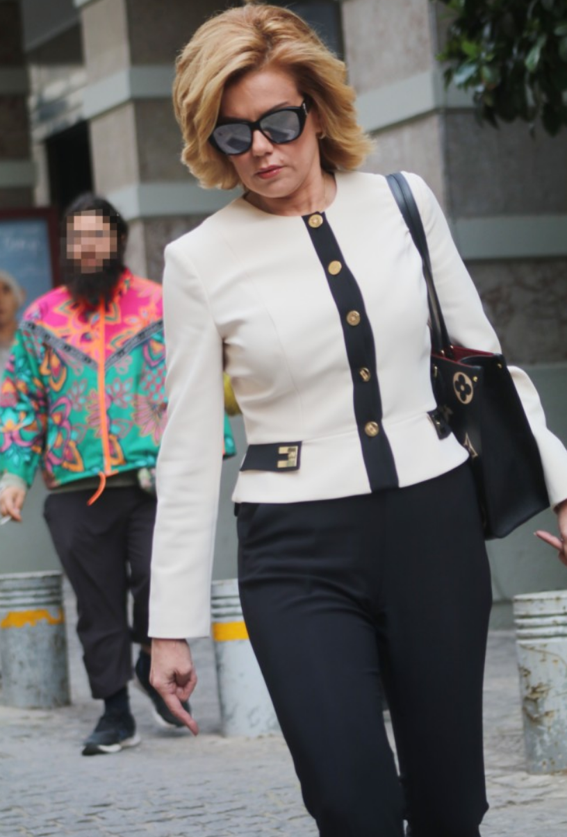 Ειδικότερα, η μαέστρος φορούσε ένα σακάκι σε ασπρόμαυρους τόνους με χρυσαφένια κουμπιά, αξίας 500 ευρώ, της Ιταλίδας σχεδιάστριας Elisabetta Franchi και το συνδύασε με μαύρο παντελόνι σε ίσια γραμμή και γόβες σε nude απόχρωση, ενώ η εμφάνισή της ολοκληρώθηκε με tote bag Louis Vuitton, αξίας 3.000 ευρώ.