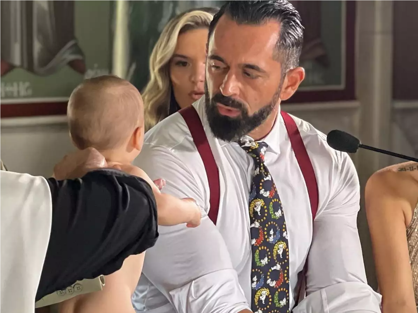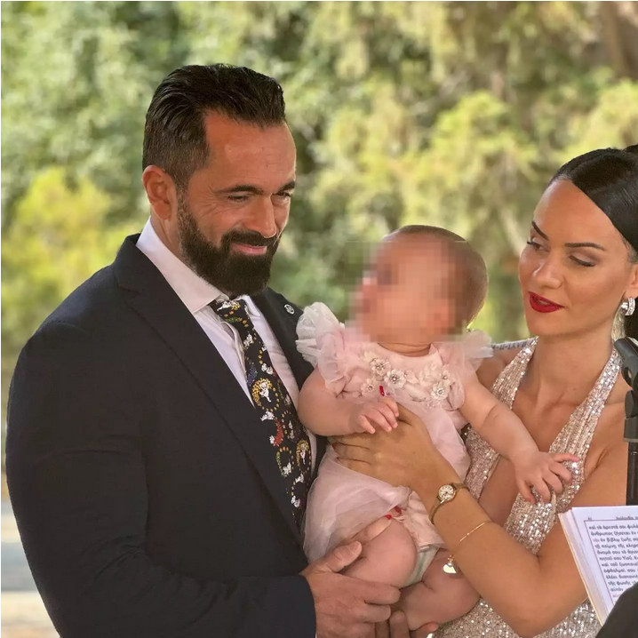 Σε ένα από τα στιγμιότυπα, ο ράπερ φαίνεται να βάζει λάδι στην βαφτιστήρα του, ενώ σε άλλα την κρατά στην αγκαλιά του.