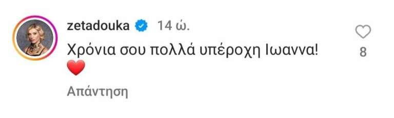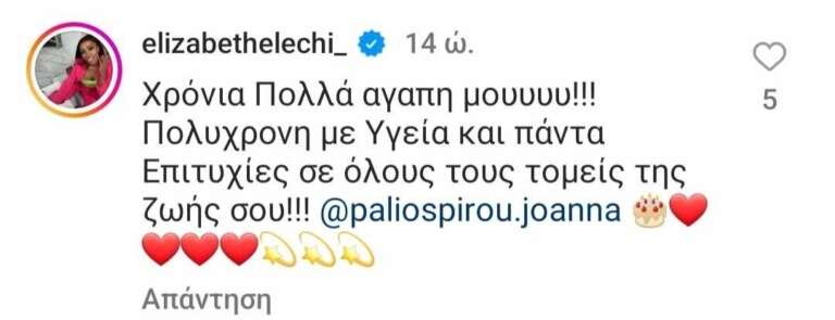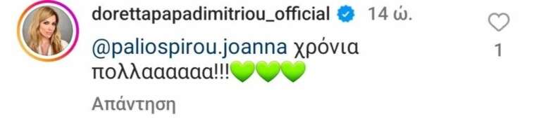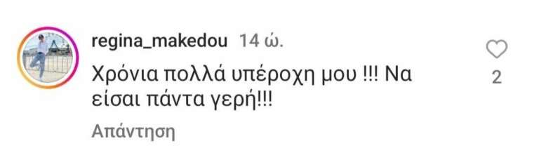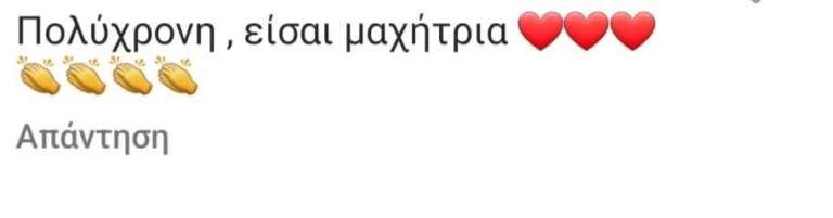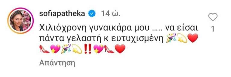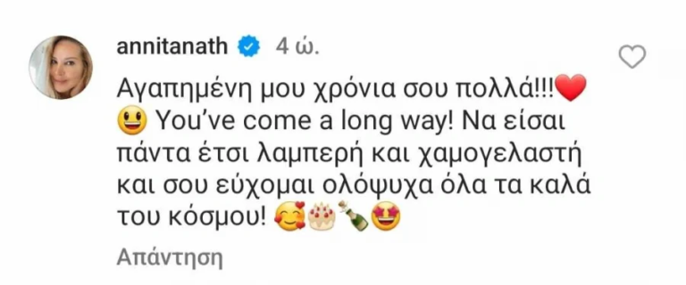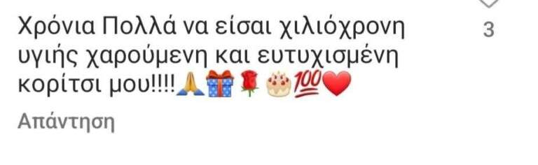 «Αγαπημένη μου χρόνια σου πολλά! Έχεις κάνει πολύ δρόμο! Να είσαι πάντα, έτσι λαμπερή και χαμογελαστή και σου εύχομαι ολόψυχα όλα τα καλά του κόσμου» της γράφει η στενή της φίλη.