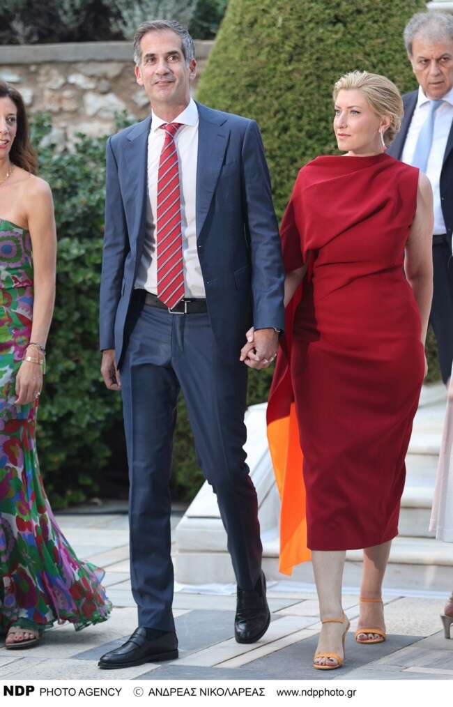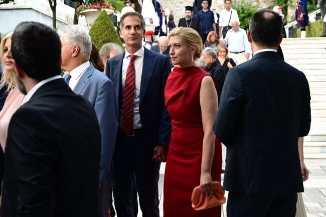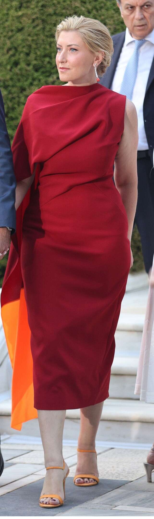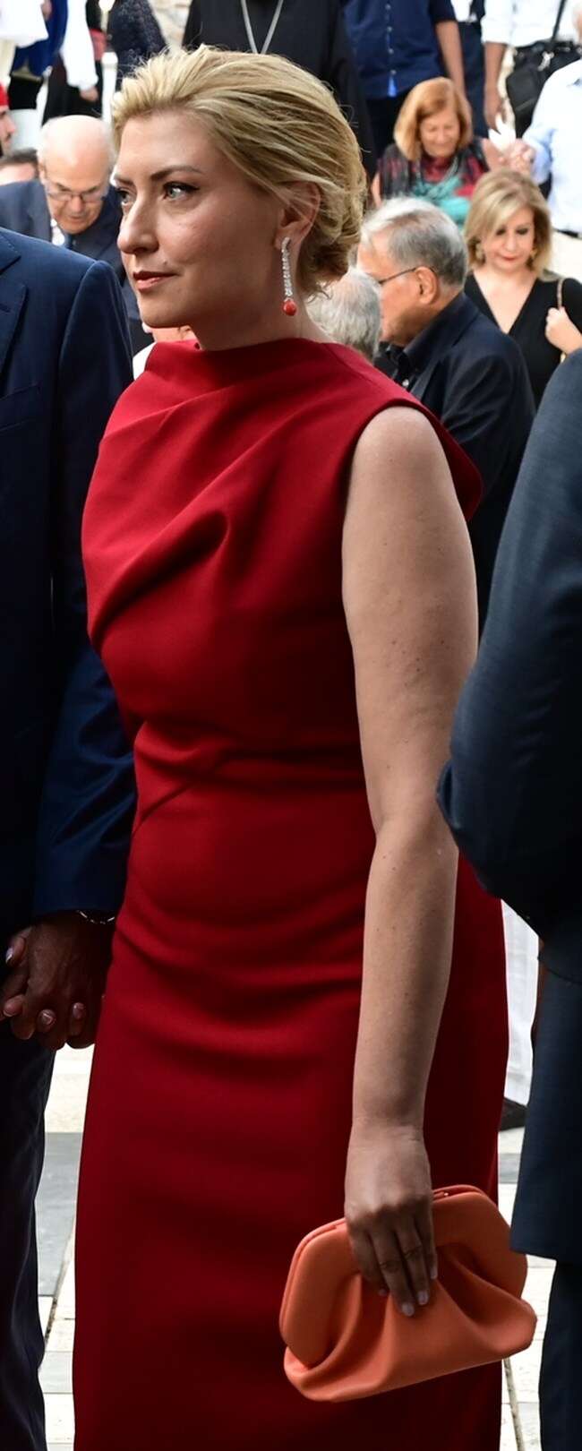 Μια από τις πιο εντυπωσιακές παρουσίες ήταν αυτή της Σίας Κοσιώνη, η οποία επέλεξε ένα φόρεμα σε έντονη απόχρωση. Συγκεκριμένα φόρεσε ένα κόκκινο μίντι φόρεμα με cape sleeve, δηλαδή ένα μανίκι που έπεφτε ως κάπα. To τελείωμα του μανικιού είχε κίτρινο χρώμα.