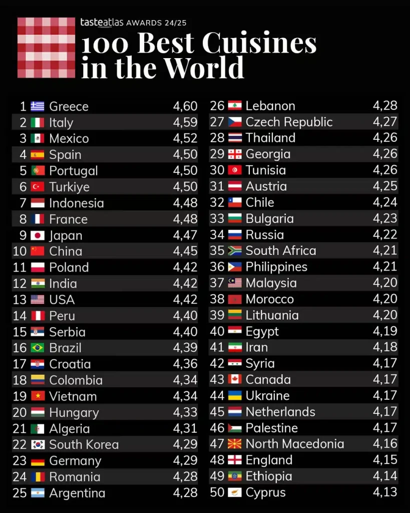Το Taste Atlas έδωσε στη δημοσιότητα τη λίστα με τις κορυφαίες κουζίνες του κόσμου και έδωσε την 1η θέση, στην Ελλάδα.