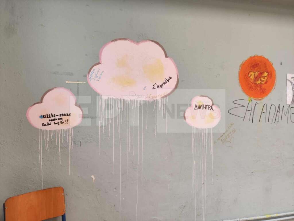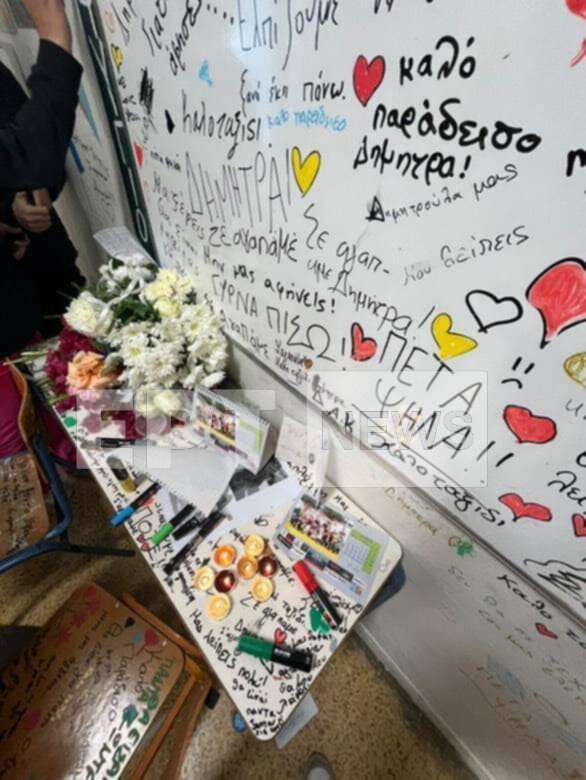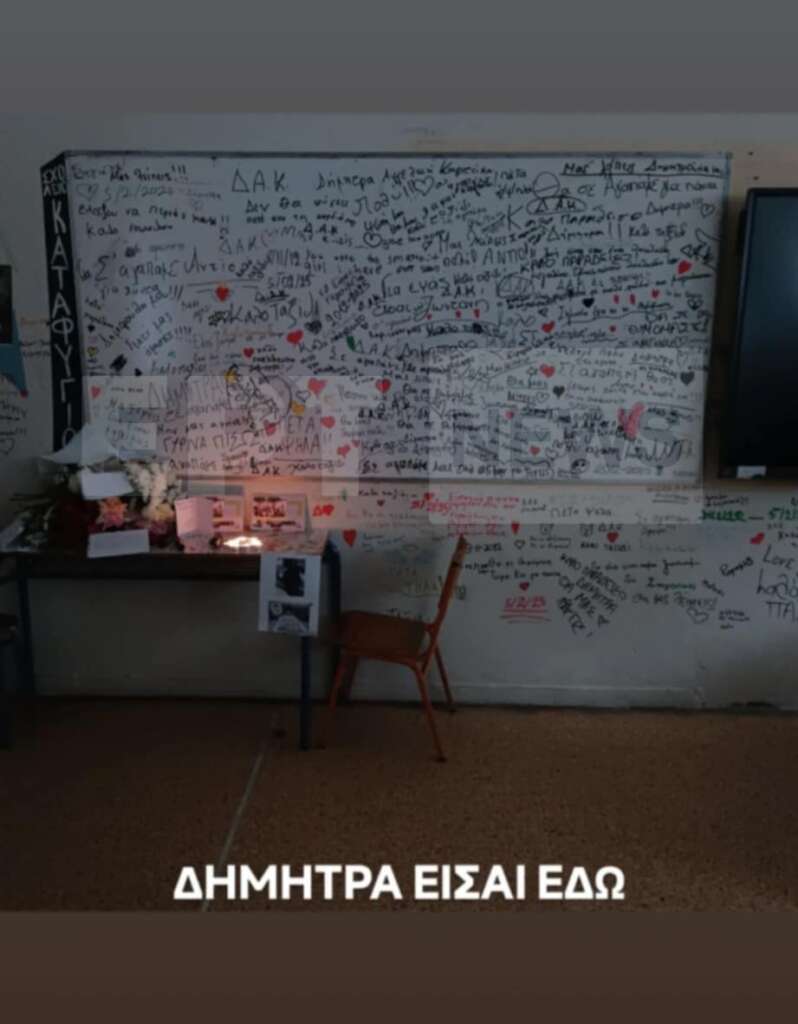 Στο τμήμα της 13χρονης Δήμητρας, οι συμμαθητές και συμμαθήτριές της, έγραψαν το δικό τους μήνυμα στον πίνακα της σχολικής αίθουσας και άφησαν μερικά λουλούδια και σημειώματα με φωτογραφίες, θρηνώντας για τον άδικο χαμό της φίλης τους.