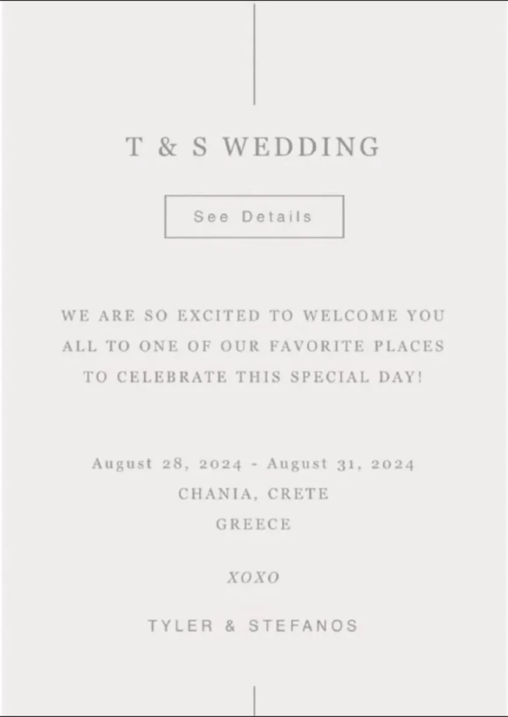 Υπενθυμίζεται ότι ο γάμος του Στέφανου Κασσελάκη και του Τάιλερ Μάκμπεθ πραγματοποιήθηκε στη Νέα Υόρκη στις 19 Οκτωβρίου 2023. Τώρα, το ζευγάρι προγραμματίζει μια γαμήλια τελετή και στην Ελλάδα, ειδικότερα στα Χανιά, μετά την ψήφιση του νομοσχεδίου που επιτρέπει τους γάμους ομόφυλων ζευγαριών.