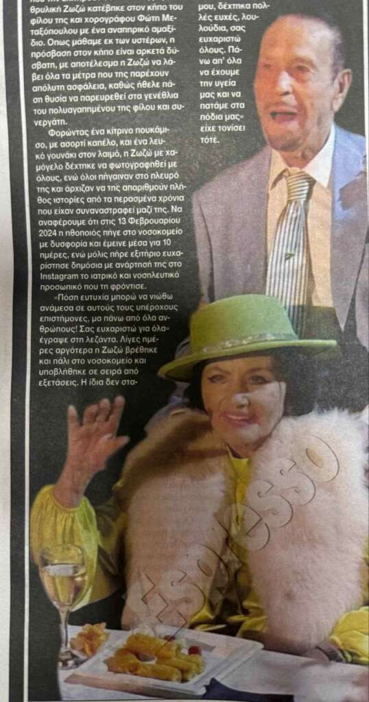 Όπως αποκαλύπτει η εφημερίδα Espresso, κατέβηκε στον κήπο του Φώτη Μεταξόπουλου με αναπηρικό αμαξίδιο. Μπορεί η πρόσβαση στον κήπο να ήταν αρκετά δύσκολη, ωστόσο, έλαβε όλα τα μέτρα που της παρέχουν απόλυτη ασφάλεια, καθώς ήθελε πάση θυσία να παρευρεθεί στα γενέθλια του πολυαγαπημένου της φίλου και συνεργάτη.