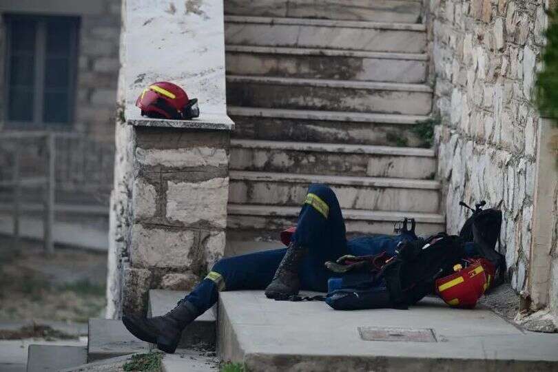 Όπως μπορείτε μάλιστα να δείτε, πυροσβέστης έχει ξαπλώσει με τη μάσκα στο πρόσωπό του, προσπαθώντας να αποκτήσει δυνάμεις, προτού συνεχίσει το τεράστιο έργο του. Η φωτογραφία που απαθανάτισε η φωτορεπόρτερ, Τατιάνα Μπόλαρη, για το πρακτορείο Eurokinissi, είναι πραγματικά συγκλονιστική.