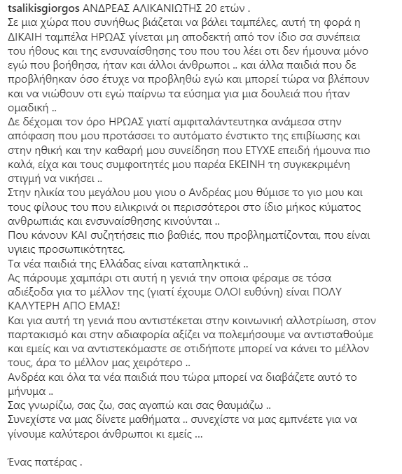 Ένας πατέρας.», έγραψε ο Γιώργος Τσαλίκης στην ανάρτησή του.