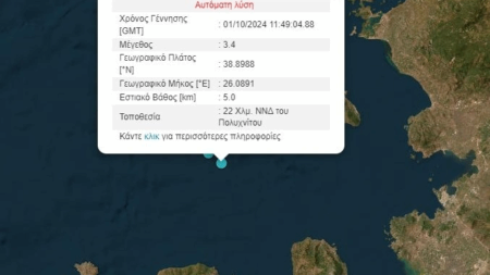 Το επίκεντρο εντοπίζεται στα 22 χιλιόμετρα ΝΝΔ του Πολυχνίτου.