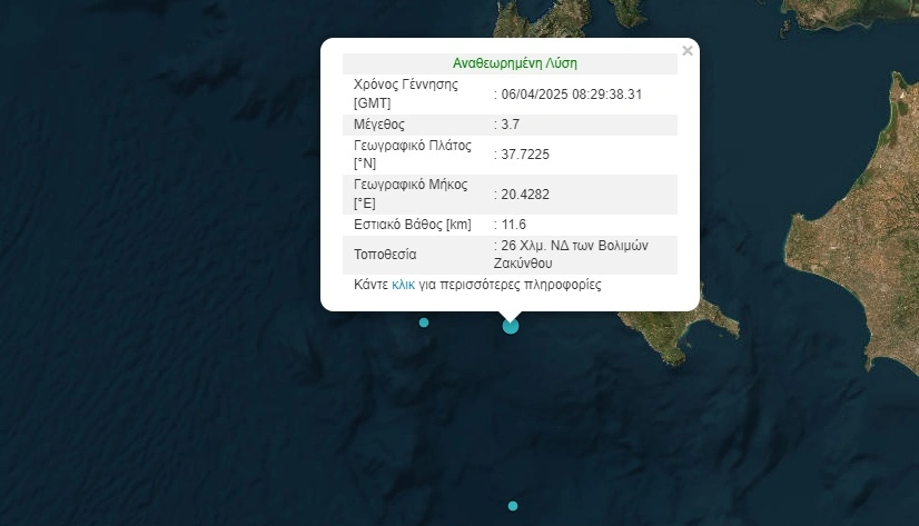 Ασθενής σεισμική δόνηση μεγέθους 3,7 Ρίχτερ καταγράφηκε το πρωί της Κυριακής 6 Απριλίου ανοιχτά της Ζακύνθου, χωρίς να προκαλέσει ιδιαίτερη ανησυχία, ωστόσο υπενθύμισε την ανάγκη επαγρύπνησης και σωστής προετοιμασίας των πολιτών απέναντι σε σεισμικά φαινόμενα.