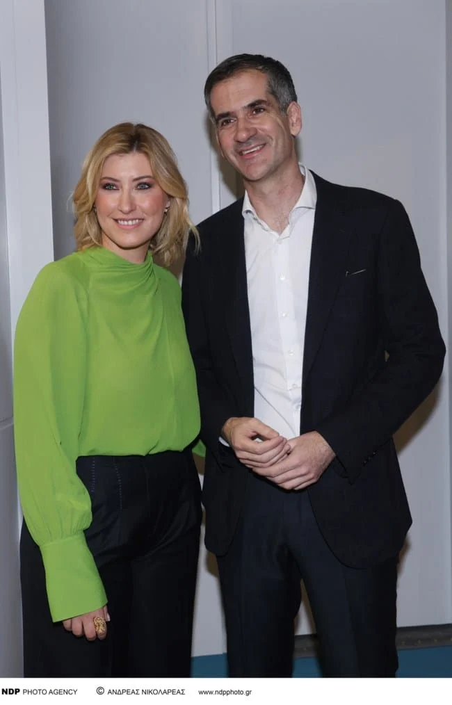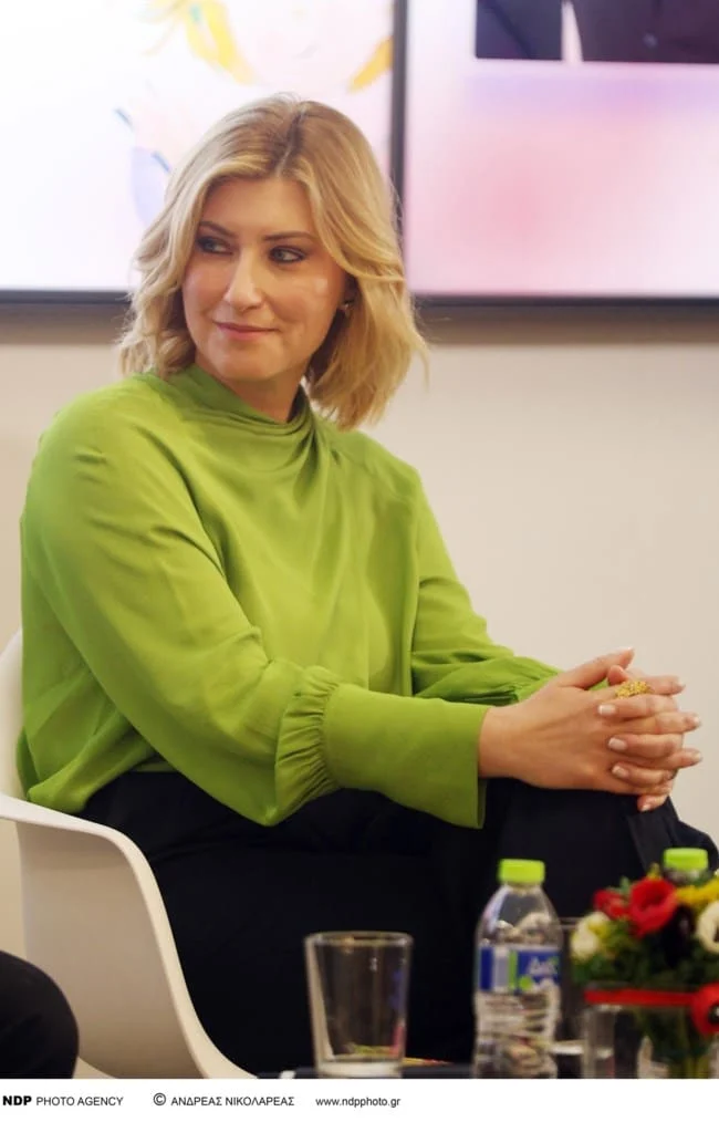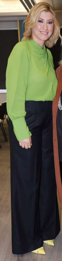 Η ίδια παρουσίασε το βιβλίο της στο κτίριο της ΕΣΗΕΑ φορώντας ένα λαχανί τοπ με κλειστό λαιμό, μαύρο παντελόνι και κίτρινες γόβες.