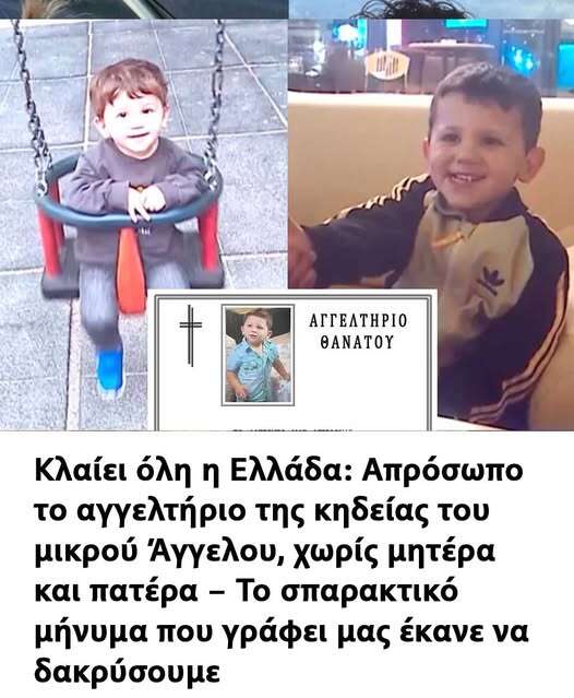 Ένα σύντομο μήνυμα γραμμένο σε πρώτο πρόσωπο αποτυπώνεται στο αγγελτήριο της κηδείας του μικρού Άγγελου που οδεύει ήδη για το μεγάλο – χωρίς επιστροφή – ταξίδι.