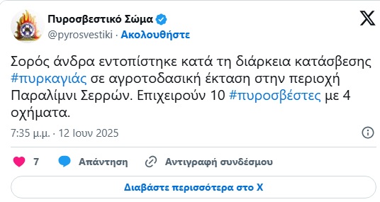 Για την φωτιά στις Σέρρες κινητοποιήθηκαν 10 πυροσβέστες με τέσσερα οχήματα