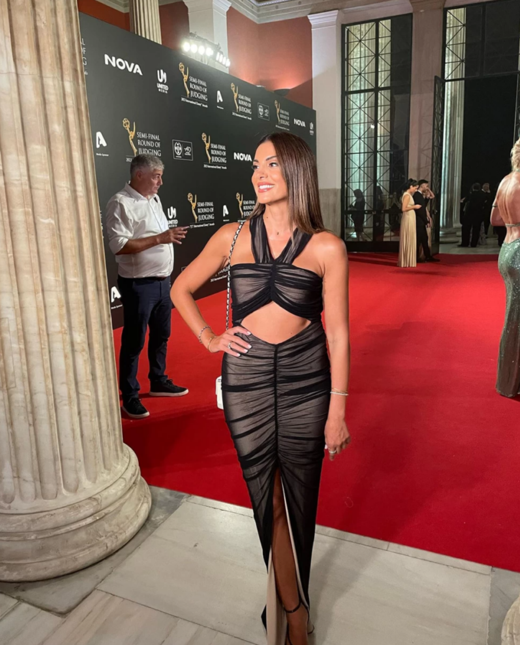 Σχετικά με την εμφάνισή της, επέλεξε ένα μάξι εφαρμοστό φόρεμα, με cut outs και κομψό halter neck σχέδιο στο μπούστο από την κολεξιόν του σχεδιαστή Steliow Koudounmaris και το συνδύασε με κομψή τσάντα Chanel και ψηλοτάκουνα πέδιλα.