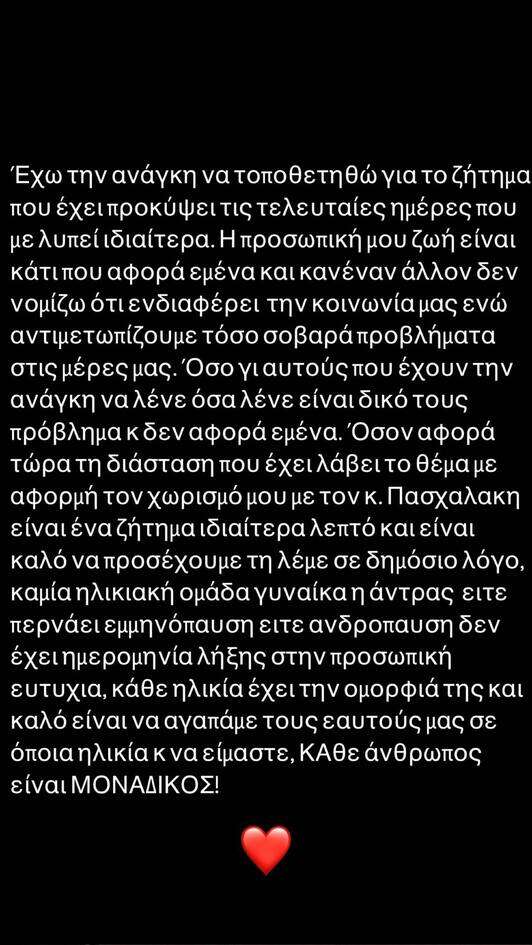 Μετά την ανάρτηση του Αλέξανδρου Πασχαλάκη για τον χωρισμό του με την Ειρήνη Παπαδοπούλου, η τελευταία προέβη και αυτή σε ανάρτηση για να κλείσει όσα στόματα έχουν τοποθετηθεί επί του θέματος.