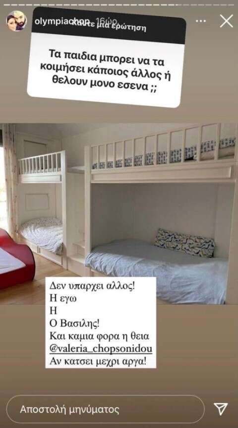 Το πρώην μοντέλο μέσα από τον προσωπικό της λογαριασμό στο Instagram μοιράζεται κάποιες στιγμές από την καθημερινότητά της με τα παιδιά, ενώ απαντά και σε απορίες άλλων μαμάδων. Παράλληλα, αξίζει να αναφέρουμε πως η Ολυμπία Χοψονίδου μέσα από τις διάφορες φωτογραφίες που ανεβάζει, έχει δείξει σημεία από την πολυτελή κατοικία τους, η οποία είναι διαμορφωμένη έτσι, για να στεγάσει τη μεγάλη οικογένειά τους.