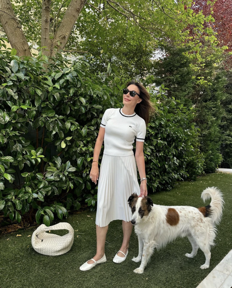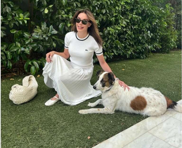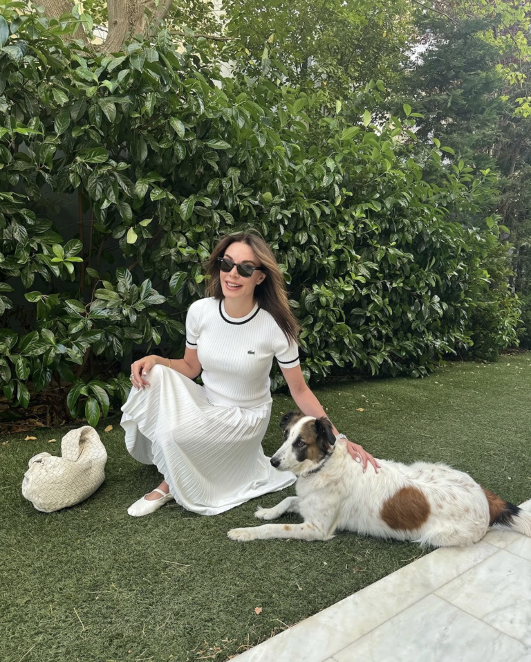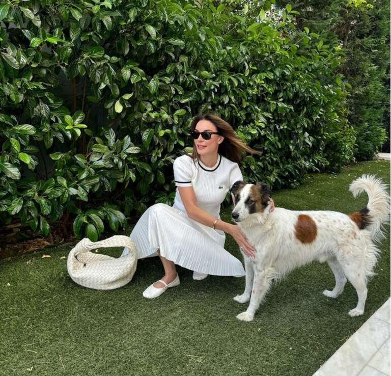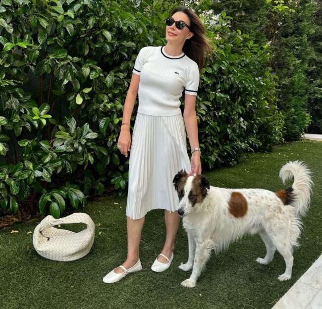 Σαν Γαλλίδα η Στεφανίδου: Με ολόλευκο tennis look, πλισέ φούστα και λευκές μπαλαρίνες, χαϊδεύει τον σκύλο της στον κήπο