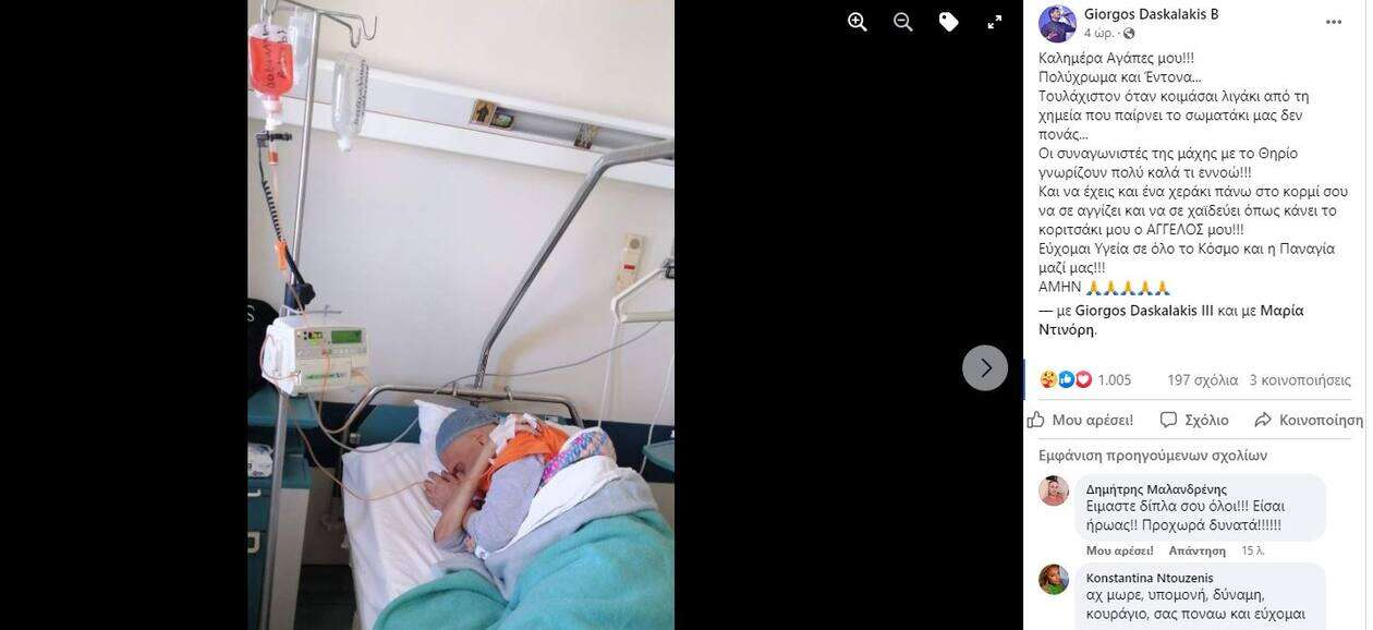 «Καλημέρα Αγάπες μου!!! Πολύχρωμα και Έντονα…Τουλάχιστον όταν κοιμάσαι λιγάκι από τη χημεία που παίρνει το σωματάκι μας δεν πονάς… Οι συναγωνιστές της μάχης με το Θηρίο γνωρίζουν πολύ καλά τι εννοώ!!! Και να έχεις και ένα χεράκι πάνω στο κορμί σου να σε αγγίζει και να σε χαϊδεύει όπως κάνει το κοριτσάκι μου ο ΑΓΓΕΛΟΣ μου!!! Εύχομαι Υγεία σε όλο το Κόσμο και η Παναγία μαζί μας!!! ΑΜΗΝ» έγραψε ο Γιώργος Δασκαλάκης.