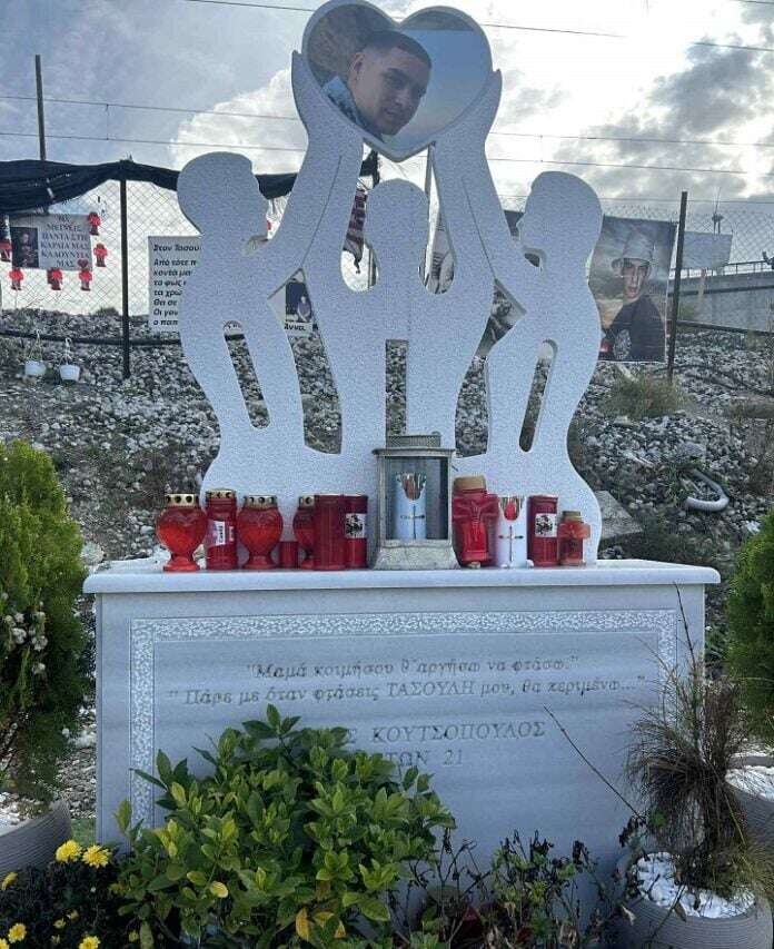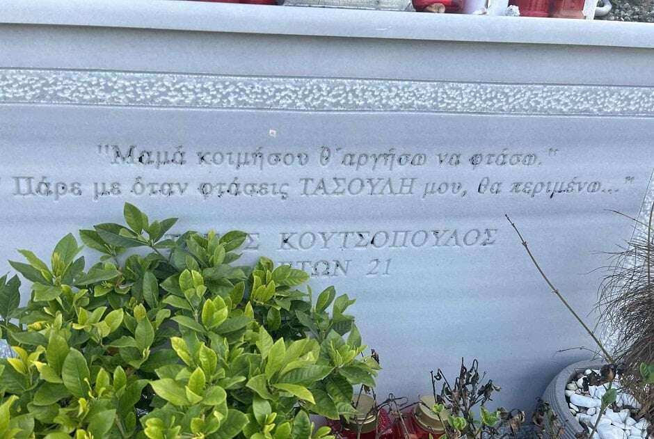 Στο μνημείο που έχει στηθεί για τον Τάσο στα Τέμπη αναγράφεται η περίφημη φράση: “Μαμά κοιμήσου θα αργήσω να φτάσω” και από κάτω η απάντηση της χαροκαμένης μάνας “πάρε με όταν φτάσεις Τασούλη μου, θα περιμένω”…