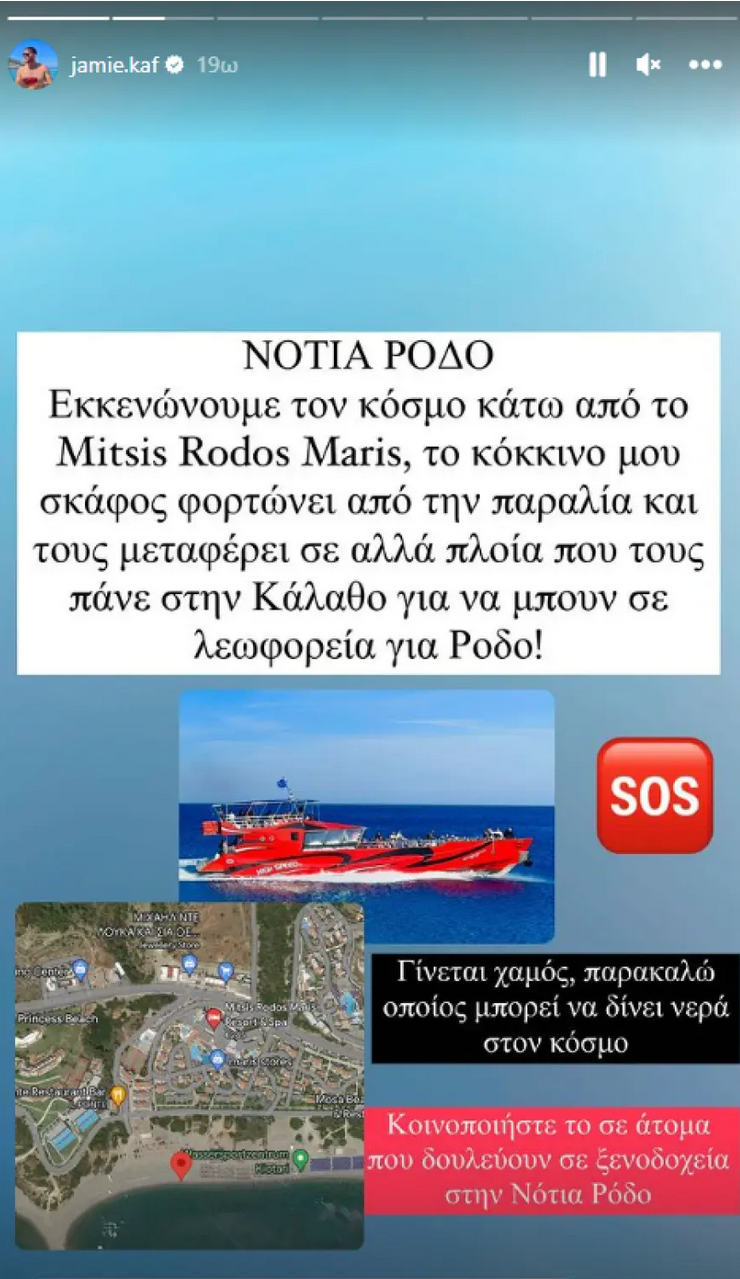 Μέσω Instagram, ο Τζέιμς Καφετζής ενημέρωσε τον κόσμο ότι: «Εκκενώνουμε τον κόσμο κάτω από το Mitsis Rodos Maris, το κόκκινό μου σκάφος φορτώνει από την παραλία και τους μεταφέρει σε άλλα πλοία που τους πάνε στην Κάλαθο για να μπουν σε λεωφορεία για Ρόδο», για όσους έχει σπεύσει να παραλάβει».