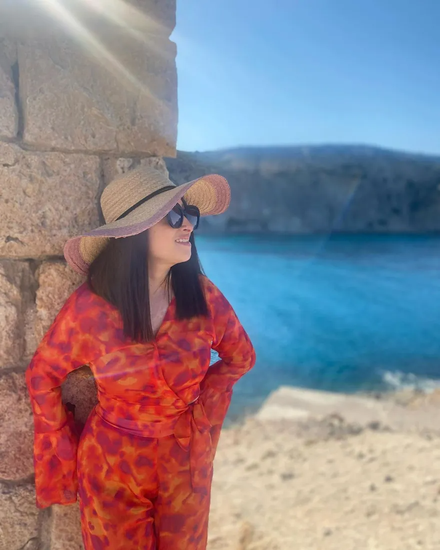Στις φωτογραφίες εμφανίζεται η ίδια να φορά μία ολόσωμη παντελόνα στα χρώματα του κόκκινου και του πορτοκαλί, ένα καπέλο και γυαλιά ηλίου, την ώρα που παίρνει διάφορες πόζες με φόντο την παραλία του νησιού.