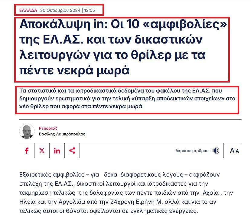 Κι είναι ενδεικτικό το ρεπορτάζ του in από τις 30 Οκτωβρίου 2024 που αναφερόταν στις «10 »αμφιβολίες» της ΕΛ.ΑΣ. και των δικαστικών λειτουργών για το θρίλερ με τα πέντε νεκρά μωρά».