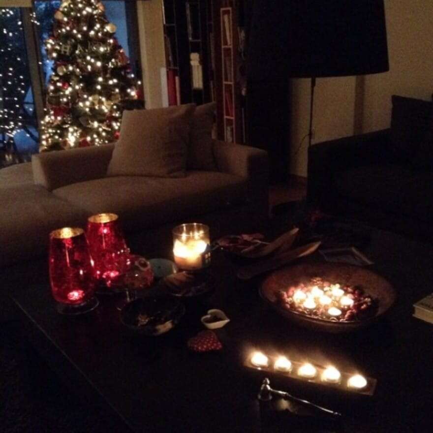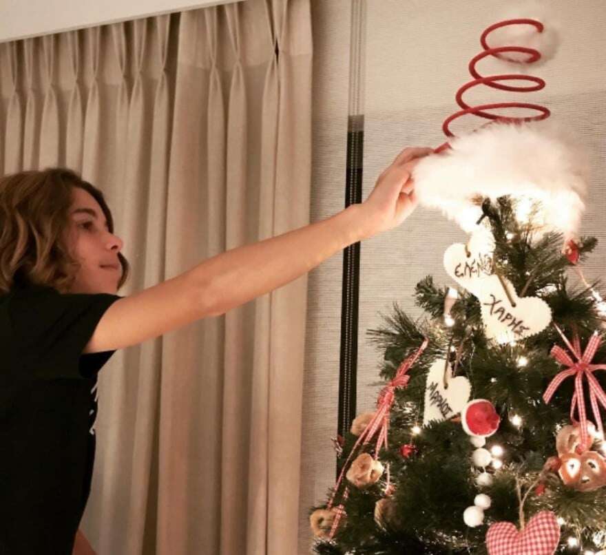 Το σαλόνι το έχει διακοσμήσει με το προσωπικό της γούστο η Έλενα Τσαβαλιά και όπως βλέπουμε ο καναπές είναι στρωμένος με πολύχρωμα καλύμματα, μερικοί τείχη είναι γκρι και στο ράφι υπάρχουν διάφορα διακοσμητικά. Μάλιστα, στην διακόσμηση βλέπουμε και αρκετά φυτά και φυσικά λουλούδια όπως μια ανθοδέσμη με τις ζέρμπερες αλλά και μια γλάστρα εσωτερικού χώρου με την αλόη.