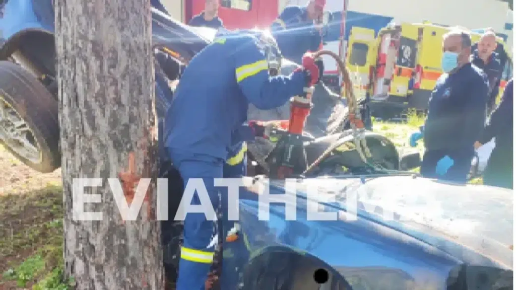 Από τη σφοδρότητα του χτυπήματος του αυτοκινήτου επάνω στο δέντρο εγκλωβίστηκαν τα δύο άτομα καθώς το αμάξι μετατράπηκε σε άμορφη μάζα.