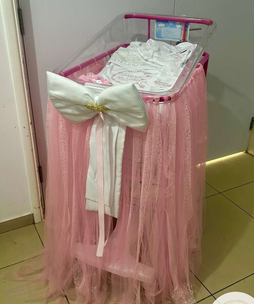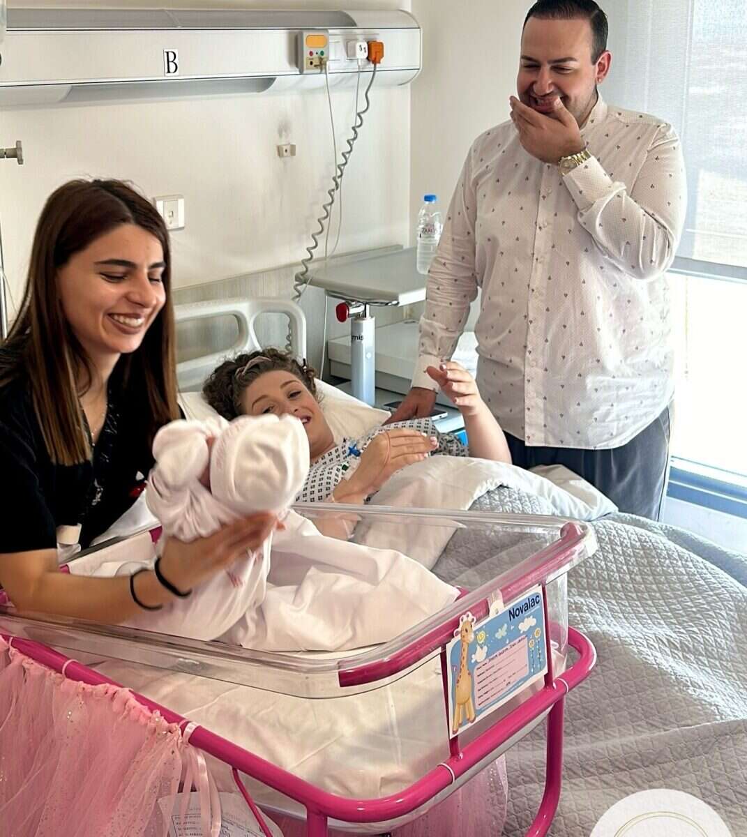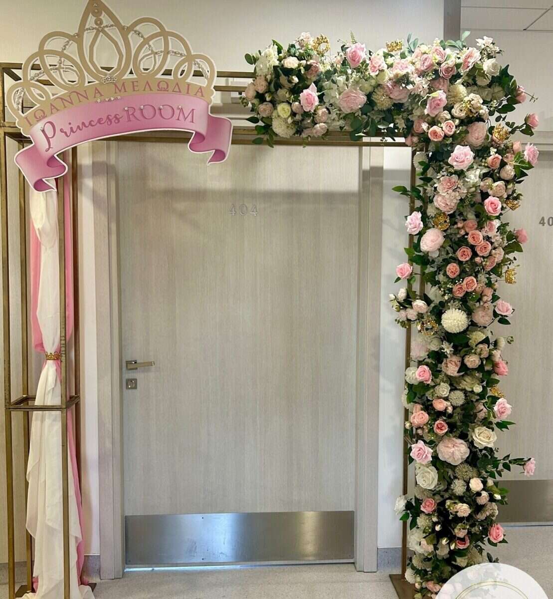 Ο θάλαμος του μαιευτηρίου όπου βρίσκεται η νέα μητέρα έχει μεταμορφωθεί σε έναν εκπληκτικό χώρο. Δεκάδες λουλούδια διακοσμούν την είσοδο, ενώ ένας μικρός μπουφές γεμάτος γλυκίσματα προσφέρει κεράσματα. Μια εντυπωσιακή τούρτα, που σηματοδοτεί τον ερχομό της μικρής πριγκίπισσας του ζευγαριού, κλέβει την παράσταση.