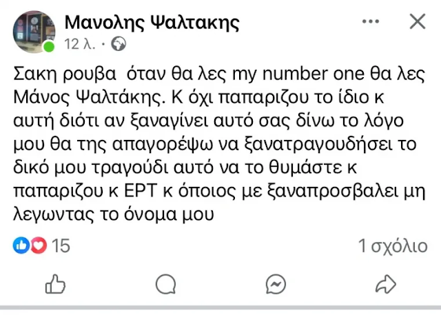 «Σάκη Ρουβά όταν θα λες my number one θα λες Μάνος Ψαλτάκης και όχι Παπαρίζου, το ίδιο και αυτή διότι αν ξαναγίνει αυτό, σας δίνω τον λόγο μου θα της απαγορέψω να ξανατραγουδήσει το δικό μου τραγούδι, αυτό να το θυμάστε και Παπαρίζου και ΕΡΤ και όποιος με ξαναπροσβάλλει μη λέγοντας το όνομά μου».