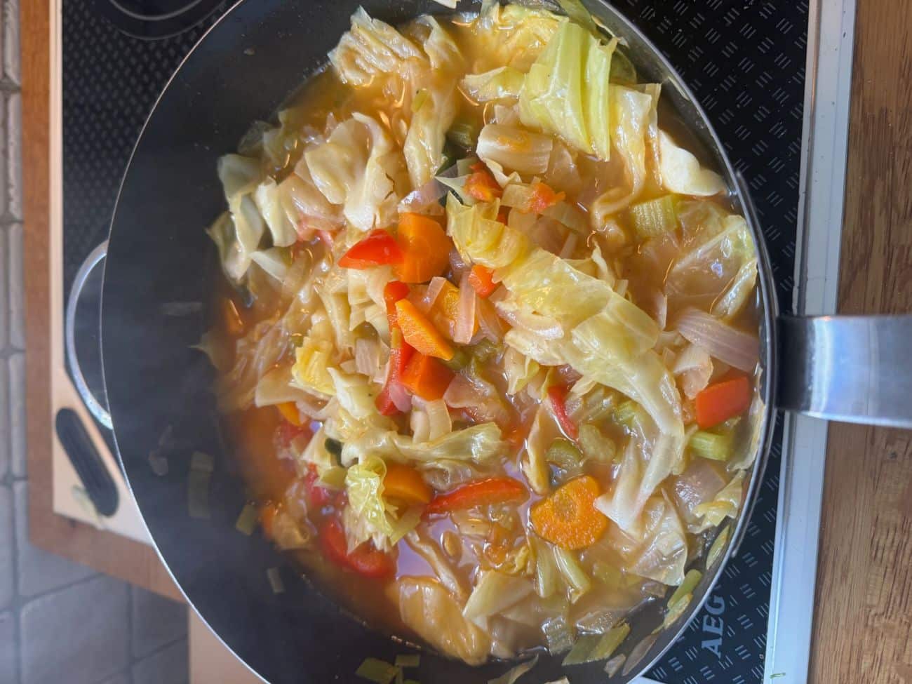 2 κουταλιάς ελαιόλαδο, 1 λευκό ή κίτρινο μεγάλο κρεμμύδι, 1 κούπα celery κομμένο, 1 κούπα καρότα κομμένα, 1 κούπα πράσινη ή κόκκινη πιπεριά ψιλοκομμένη, 3 σκελίδες σκόρδο, τα σοτάρετε καλά και μετά από λίγα λεπτά ρίχνετε 4 κούπες βρασμένο νερό με έναν κύβο κοτόπουλο, ( έβαλα λαχανικών ), 1 Ντομάτα μεγάλη ή μια κονσέρβα ντομάτα, έριξα αρκετό φρέσκο βασιλικό, ρίγανη αλάτι και πιπέρι και λίγο μπούκοβο και μετά μισό λάχανο κομμένο σε κομματάκια. Σιγοβράζετε για κανένα 15 λέπτο και είναι τόσο νόστιμη σερβίρετε μαζί με λίγο πιπέρι καγιέν ( βοηθάει στο να χάσεις καλύτερα).