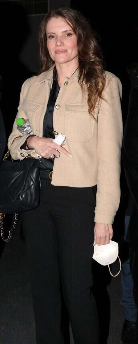 Η πάντοτε κομψή Κιμ Κίλιαν φόρεσε ένα μαύρο παντελόνι ένα μαύρο σατέν πουκάμισο και ένα μπεζ κοντό τζάκετ. Κράτησε μια μεγάλη δερμάτινη τσάντα και το μακιγιάζ της ήταν διακριτικό.