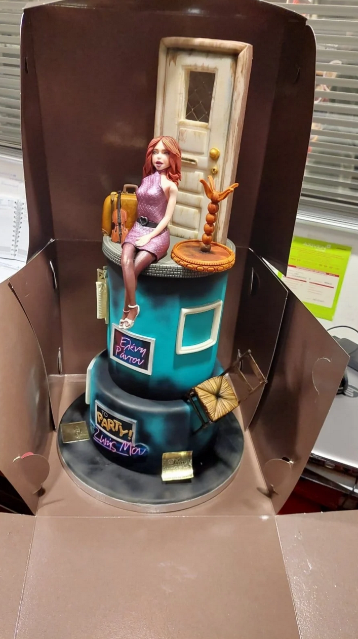 Η τούρτα ήταν σε μπλε και μαύρο χρώμα, θυμίζοντας διαμέρισμα και στο μπροστινό μέρος αναγραφόταν το όνομα της αλλά και ο τίτλος της παράστασης. Το πάνω μέρος της τούρτας ήταν διακοσμημένο με ένα ομοίωμα της Ράντου δίπλα στο οποίο ήταν τοποθετημένος ένας καλόγερος και μία βαλίτσα.