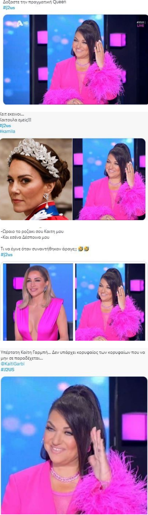 Μια άκρως εντυπωσιακή εμφάνιση έκανε στο live του J2US η Καίτη Γαρμπή. Μάλιστα, το ντύσιμό της και κυρίως η χρωματική παλέτα του, ήταν παρόμοια με αυτό της Δέσποινας Βανδή, κάτι που φυσικά δεν άφησε κανείς ασχολίαστο.