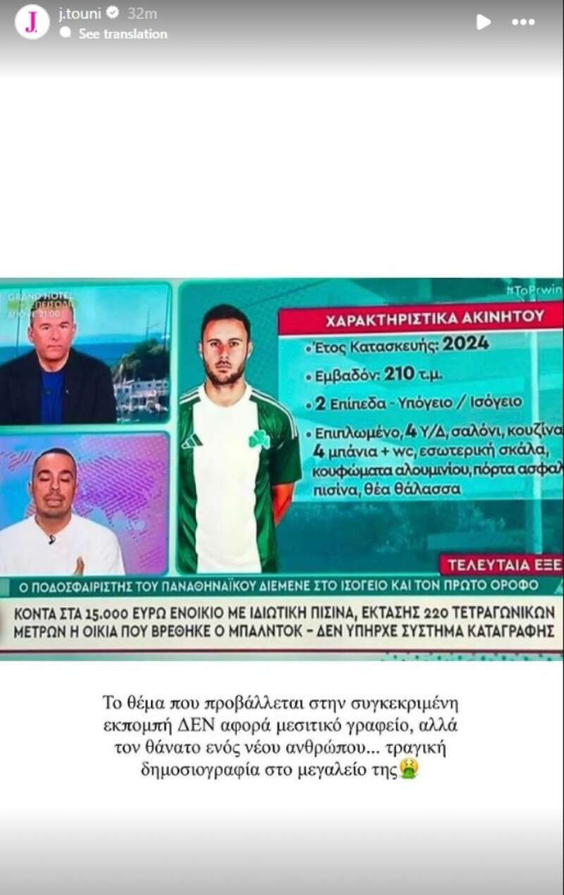 Λίγο αργότερα, η Ιωάννα Τούνη ανήρτησε ένα story στο Instagram, μέσα από το οποίο στράφηκε εναντίον του Γιώργου Λιάγκα, γράφοντας: «Το θέμα που προβάλλεται στην συγκεκριμένη εκπομπή ΔΕΝ αφορά μεσιτικό γραφείο, αλλά τον θάνατο ενός ανθρώπου… τραγική δημοσιογραφία στο μεγαλείο της».