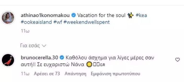 «Διακοπές για την ψυχή» έγραψε η Αθηνά Οικονομάκου με τον Μπρούνο Τσερέλα να σχολιάζει κάτω από την ανάρτησή της «Καθόλου άσχημα για λίγες μέρες σαν αυτή!! Σε ευχαριστώ Νανά», αναφερόμενος ο σύντροφός της για τις διακοπές τους στην Τζια.