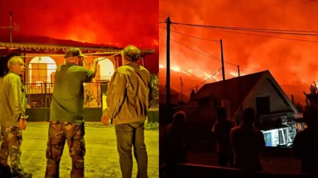 Τα ξημερώματα εστάλη εκ νέου μήνυμα από το 112 στους κατοίκους της περιοχής Πύργος Κορινθίας, για να απομακρυνθούν προς Ζάχολη, ενώ οι φλόγες πέρασαν στον οικισμό των Ανω Λουτρών και έχουν καεί σπίτια.