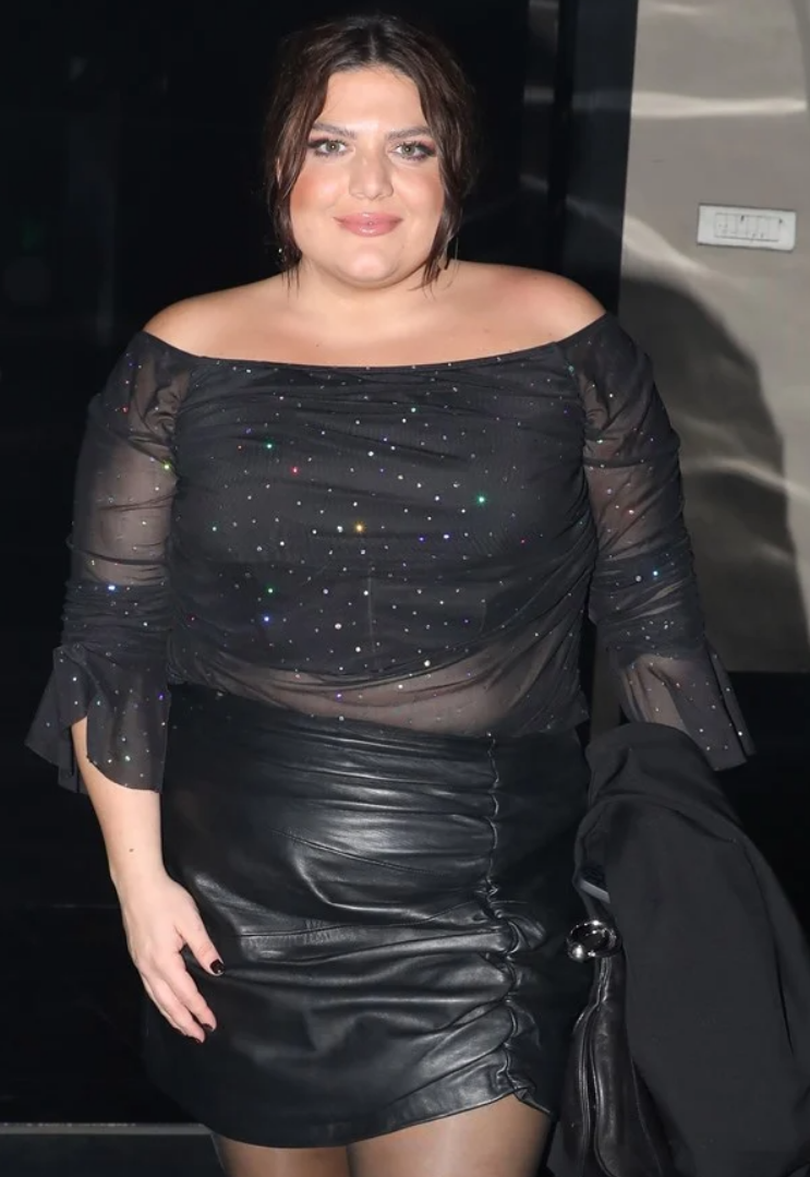 Η Δανάη Μπάρκα φόρεσε μια δερμάτινη ντραπέ μίνι φούστα και ένα έξωμο τοπ με στρας και διαφάνειες.