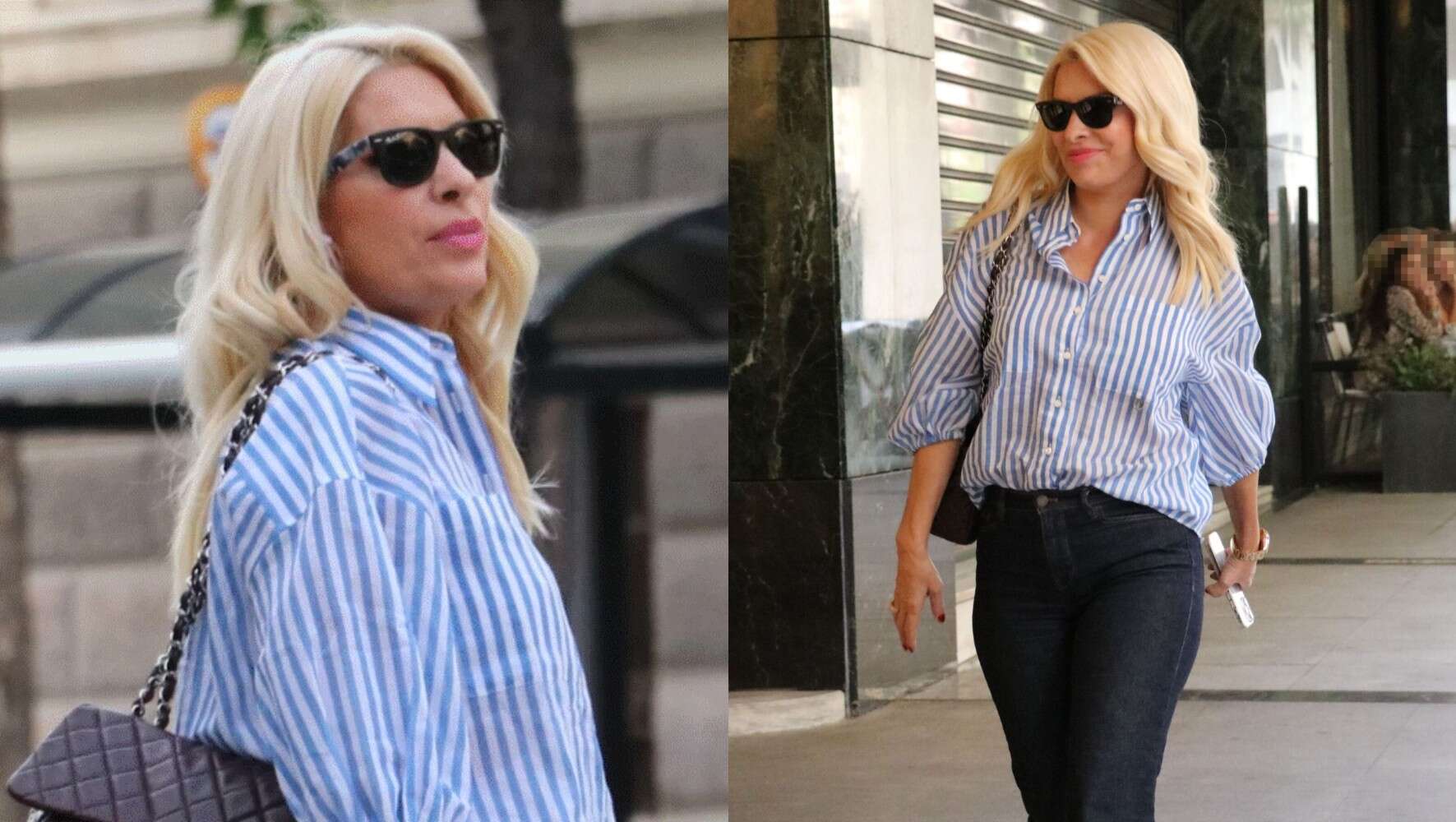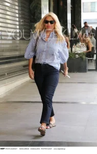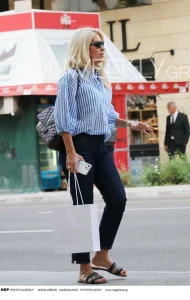 Αν και πολύ απλά ντυμένη, ήταν άκρως εντυπωσιακή! Είχε επιλέξει να συνδυάσει ένα σκούρο μπλε τζιν με ένα ριγέ πουκάμισο σε γαλάζιο και λευκό χρώμα. Στα χέρια της κρατούσε μία τσάντα από τα ψώνια της, αλλά και μία καπιτονέ βόλτας, πολύ γνωστής εταιρείας, και ολοκλήρωσε το look της με παντόφλες και γυαλιά ηλίου στο πρόσωπο.