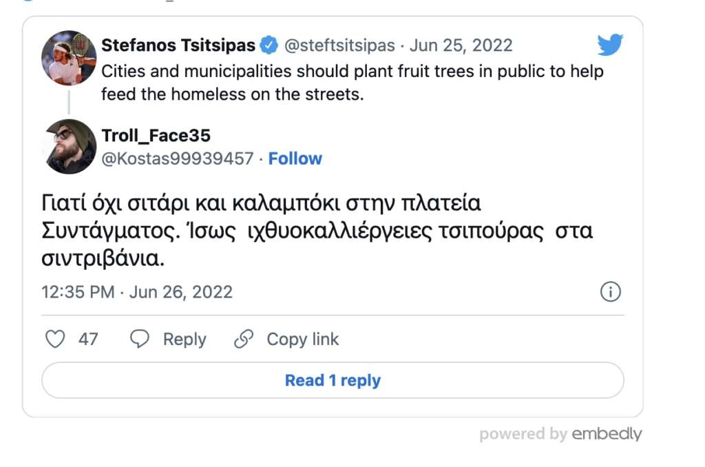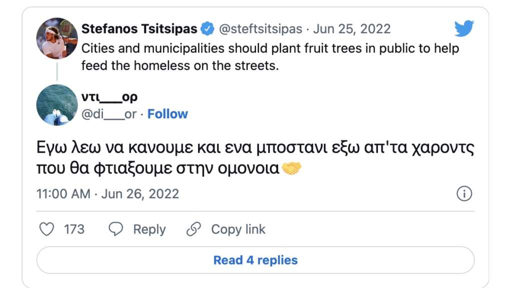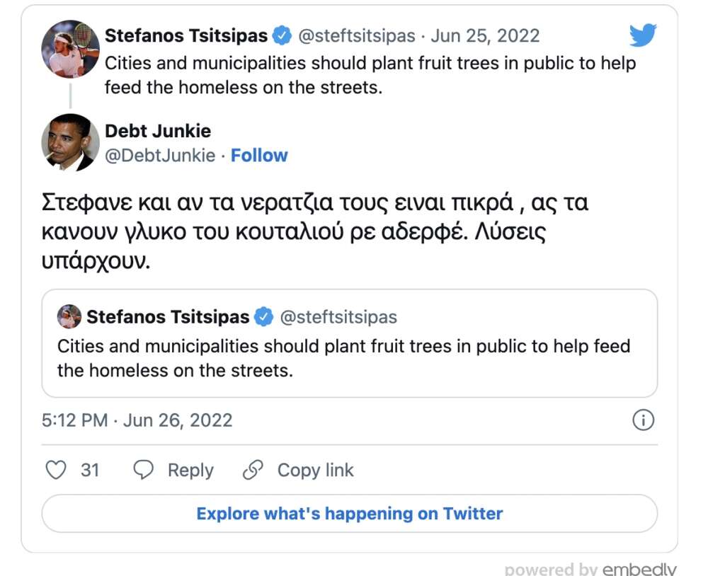 Ο κορυφαίος Έλληνας τενίστας και Νο 5 παγκοσμίως έχει απασχολήσει κατά καιρούς τη δημοσιότητα με δηλώσεις και “τιτιβίσματα”, προκαλώντας αντιδράσεις και αρνητικά σχόλια. Σε χθεσινή του ανάρτηση, ο Στέφανος Τσιτσιπάς πρότεινε οι δήμοι να φυτέψουν οπωροφόρα δέντρα για να τρώνε οι άστεγοι.