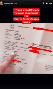Μέσω Instagram stories, το μοντέλο ανέβασε μια φωτογραφία με τη ληξιαρχική πράξη της Πάρις, όπως έχει ονομάσει το παιδί της, το οποίο γέννησε τον Φεβρουάριο. Ο λόγος που δημοσίευσε το παραπάνω έγγραφο, είναι το επίθετο του μωρού, που πλέον έχει το όνομα του πατέρα του, για τον οποίο δεν έχουν γίνει γνωστά πολλά στοιχεία.