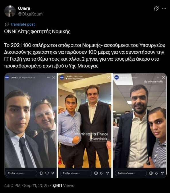 Ο νεαρός φοιτητής, ο οποίος κατάφερε να γίνει viral με τις δηλώσεις του, τόνισε πως η κυβέρνηση της ΝΔ είναι η πρώτη που νοιάζεται πραγματικά για τους νέους και ότι πλέον έχουν κίνητρο να δουλέψουν σκληρά και να αποταμιεύσουν από μικρή ηλικία. Ωστόσο, οι συμφοιτητές του, όπως λένε, υποστηρίζουν πως ο νεαρός όχι μόνον έχει φωτογραφηθεί με πολλούς υπουργούς της ΝΔ, αλλά είναι και βαφτιστήρι του Μάκη Βορίδη, του υπουργού που παραιτήθηκε από τη θέση του μετά το σκάνδαλο του ΟΠΕΚΕΠΕ, όπως αποκαλύπτει το documento.gr.