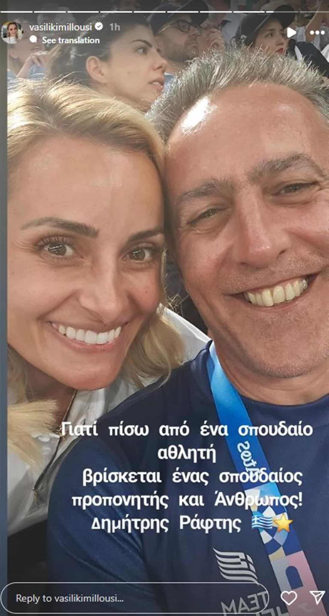 Η ίδια, ποζάρει χαμογελαστή στο πλευρό του Δημήτρη Ράφτη και στην λεζάντα της φωτογραφίας γράφει: “Γιατί πίσω από ένα σπουδαίο αθλητή βρίσκεται ένας σπουδαίος προπονητής και άνθρωπος! Δημήτρης Ράφτης”.
