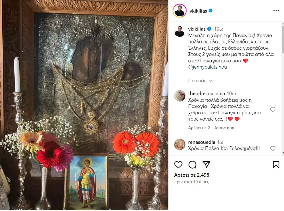 «Μεγάλη η χάρη της Παναγίας! Χρόνια πολλά σε όλες τις Ελληνίδες και τους Έλληνες. Ευχές σε όσους γιορτάζουν. Στους δύο γονείς μου μα πρώτα από όλα στον Παναγιωτάκο μου», έγραψε ο Βασίλης Κικίλιας δημοσιεύοντας φωτογραφία της Παναγίας.