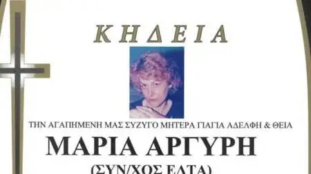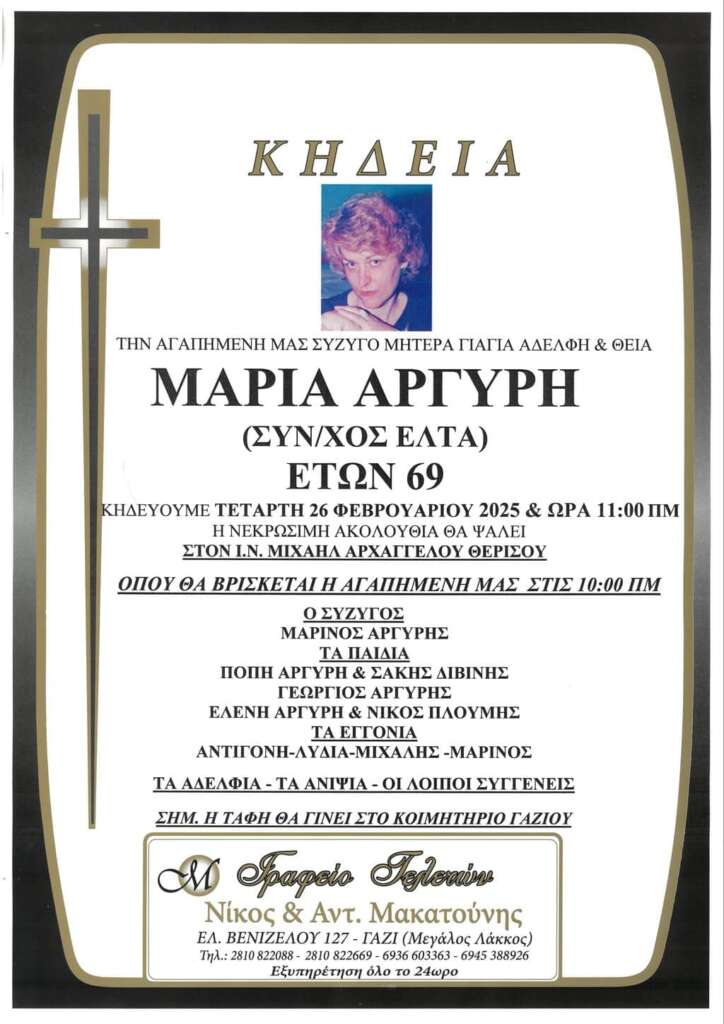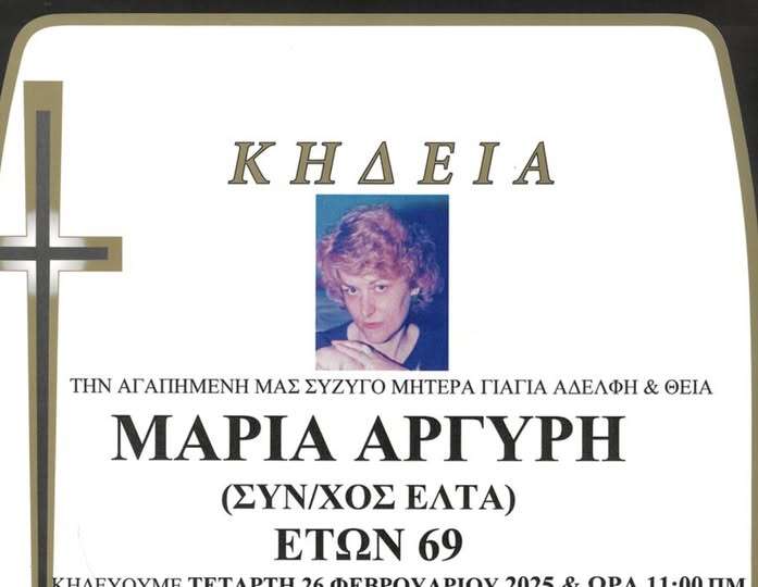 Η Μαρία Αργύρη, μητέρα 5 παιδιών και γιαγιά 4 εγγονιών, έφυγε ξαφνικά σε ηλικία 69 ετών από την ζωή, σκορπίζοντας θλίψη στους φίλους και συγγενείς της.