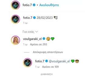 Συγκεκριμένα, η Ελένη Βουλγαράκη άφησε μια χαμογελαστή φάτσα μαζί με μια πράσινη καρδιά κάτω από τη φωτογραφία του Φώτη Ιωαννίδη, με εκείνον να απαντά με ανάλογο τρόπο, στην νίκη του Παναθηναϊκού, όπου σκόραρε.