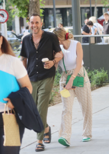 Η 30χρονη φαρμακοποιός και κολλητή φίλη της Κατερίνας Καινούργιου, που γέννησε στις 14 Σεπτεμβρίου, φόρεσε ένα λευκό αμάνικο τοπ, με παντελόνι σε loose γραμμή με pied de poule σχέδια, μια πράσινη τσάντα Jacquemus αθλητικά παπούτσια Jordan της Νike.